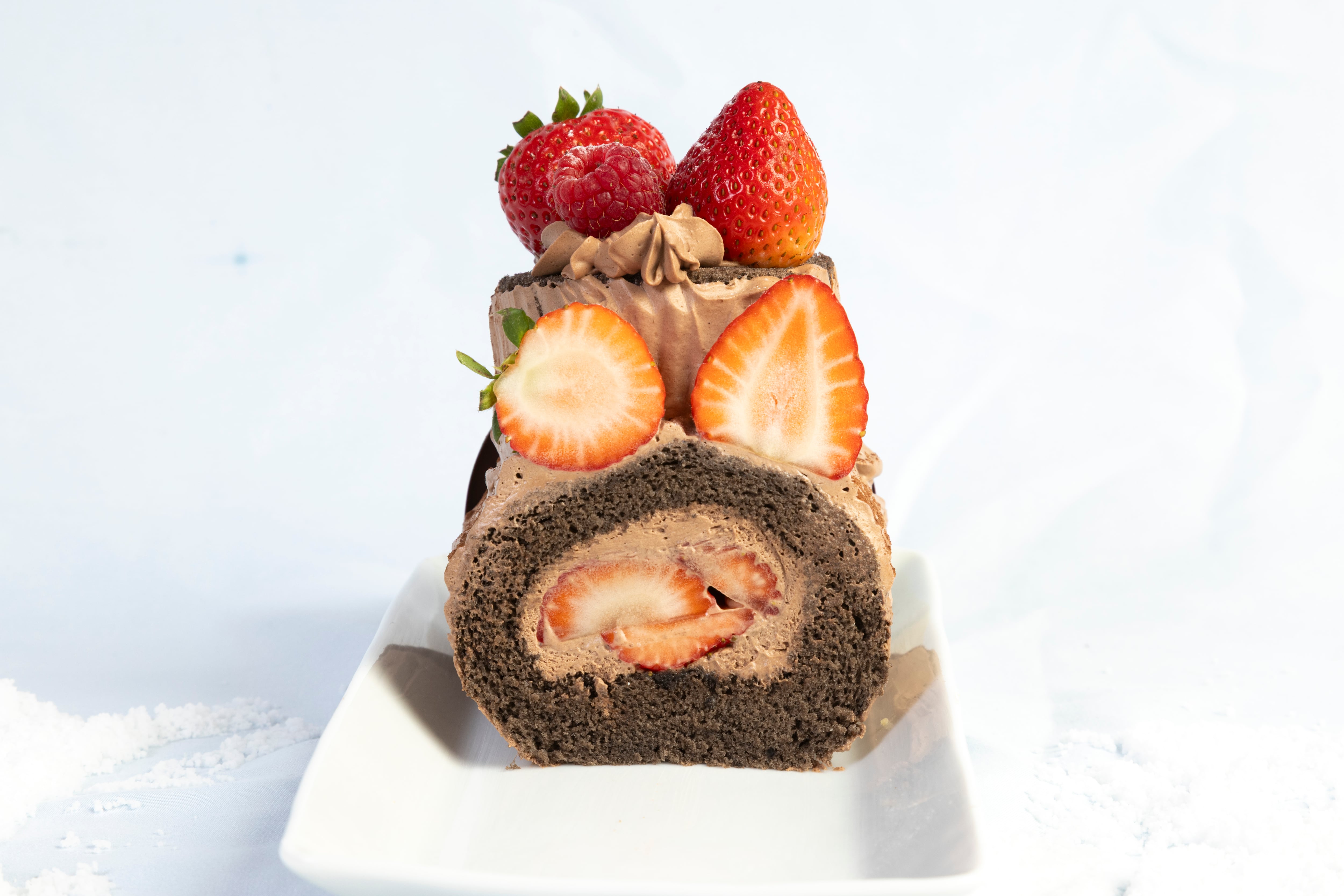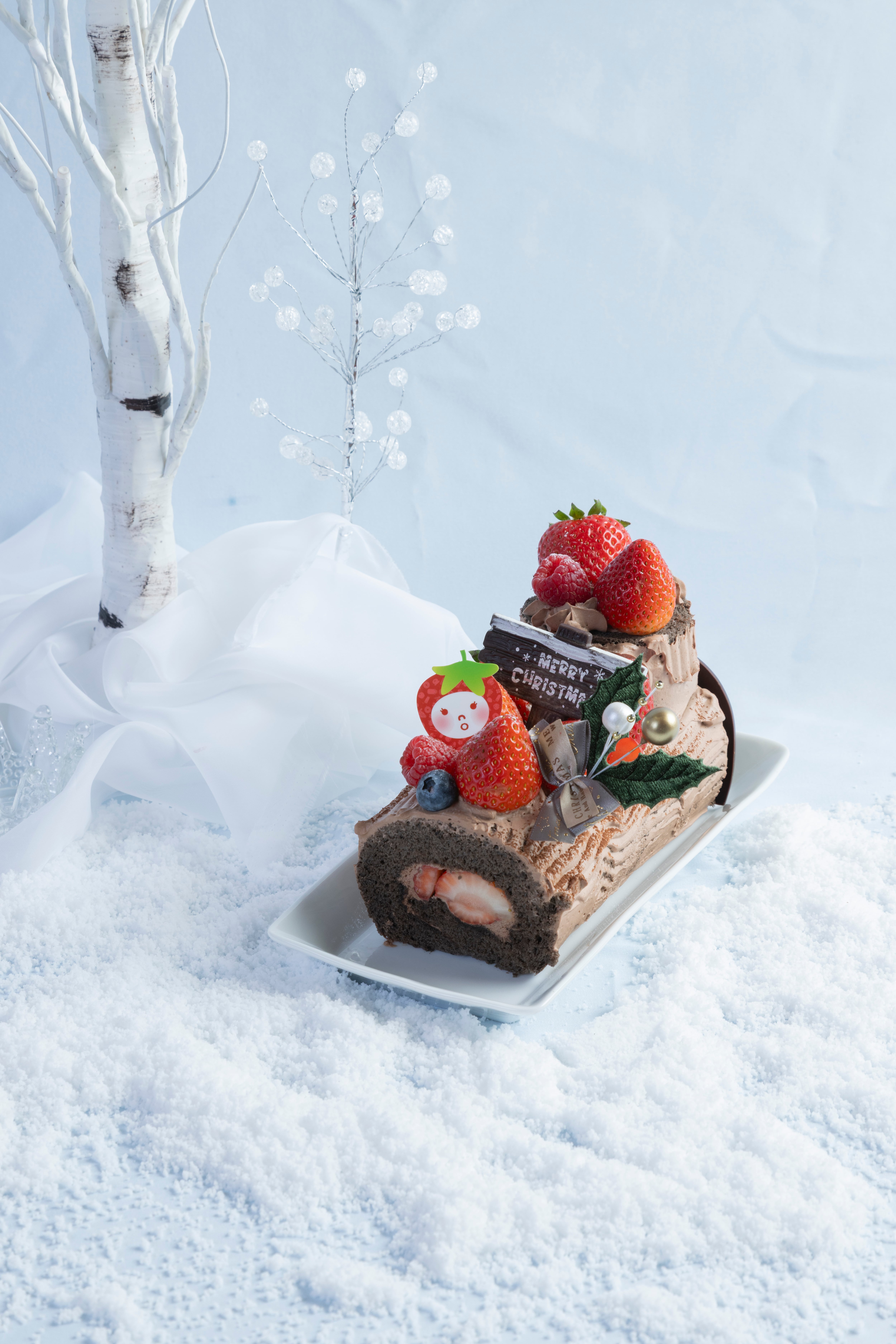 濃厚ベルギー産チョコ使用のクリームを使用する切株デザインのXmasロールケーキ。