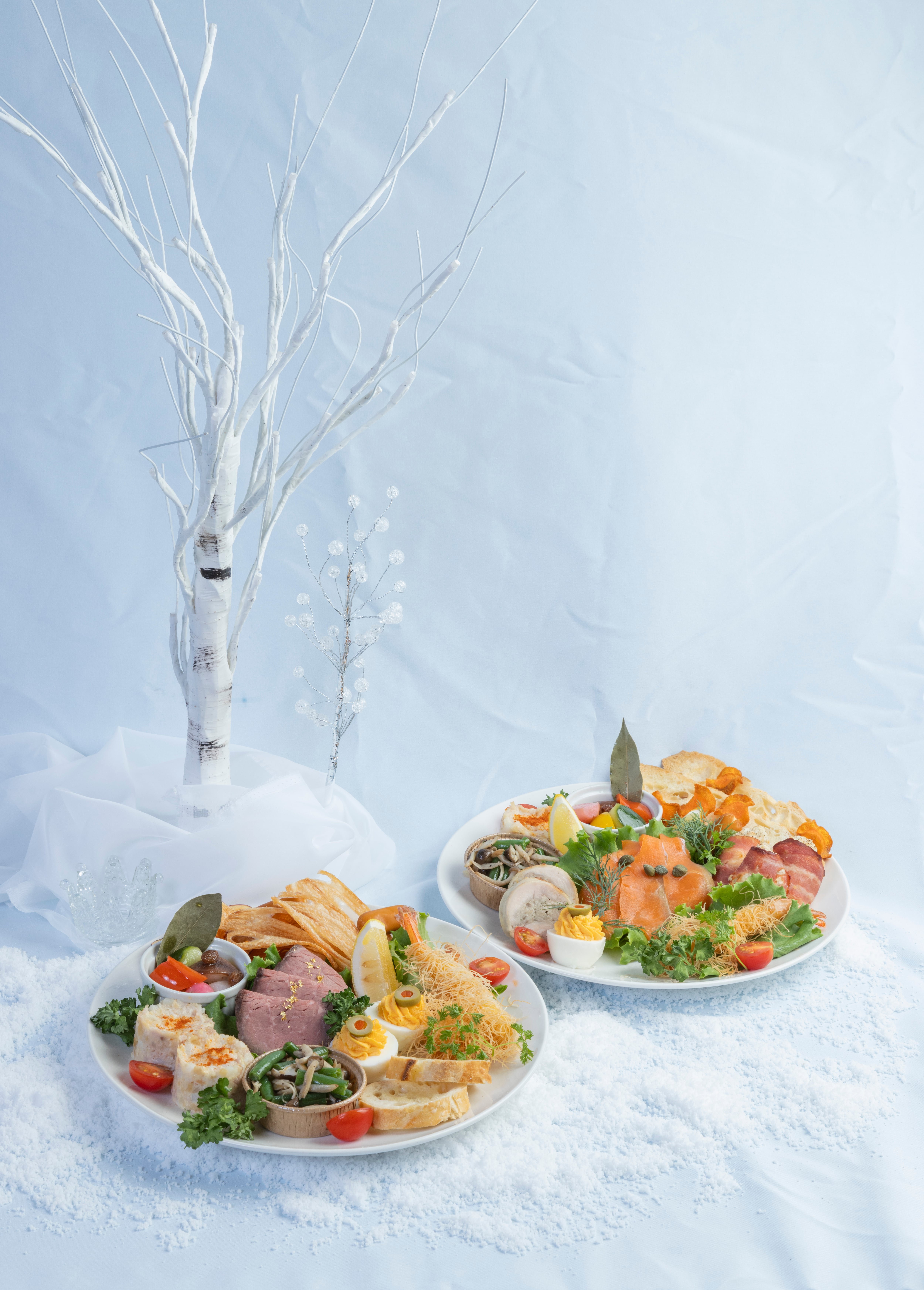 ナッツ入りポテトサラダ/海老のカダイフ/ローストビーフ金箔添え/スモークサーモン/根菜チップ&スモークチーズ/若鶏のバロティーヌ/野菜のクルディテ/スタッフエッグ/牡蠣の衣焼きベーコン風味バケット